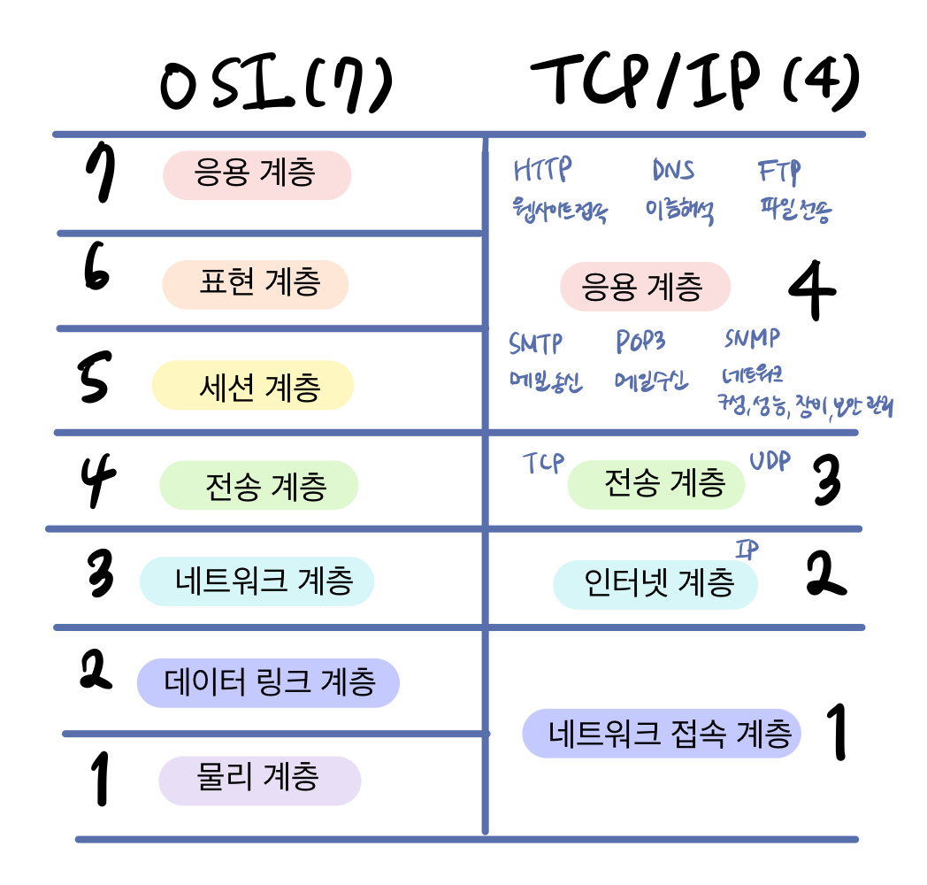 | 4층 (사용자에 가까움) | 응용 계층 | HTTP, DNS 등 | 애플리케이션에 맞추어서 통신 |
